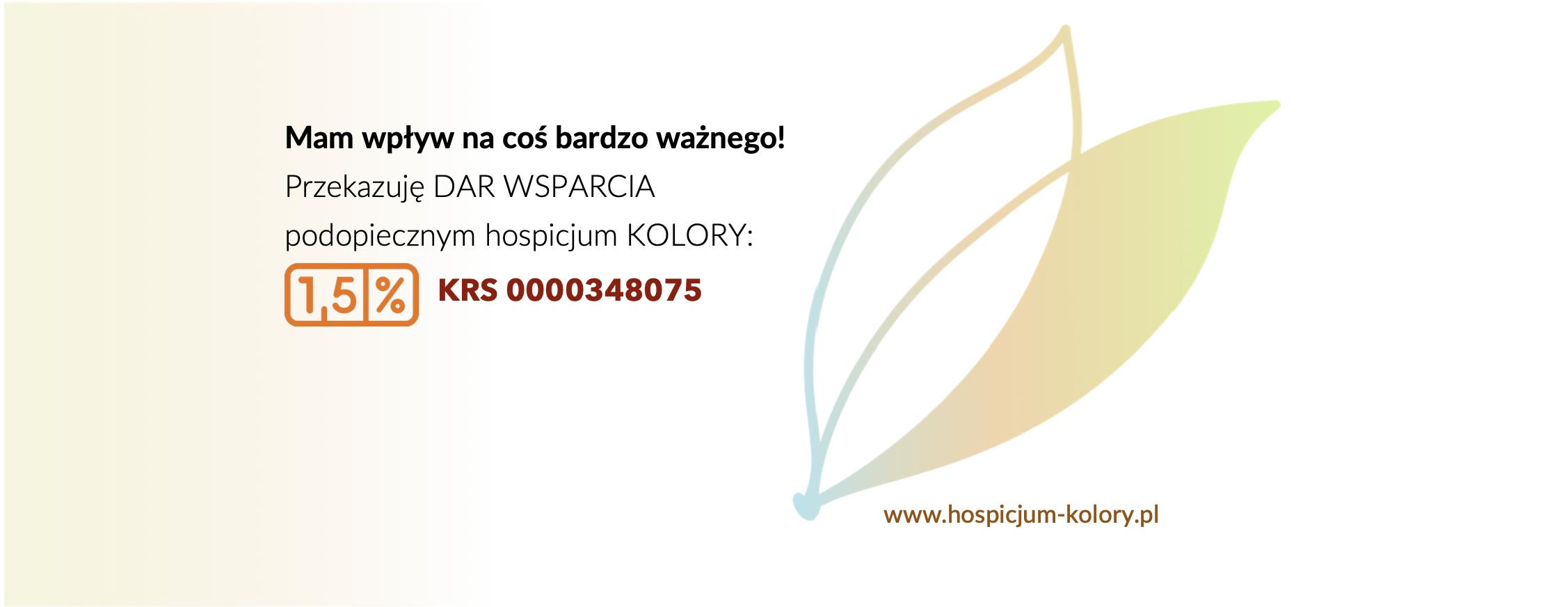 Fakt, że tu jesteś, to dla nas nadzieja, że chcesz z nami współuczestniczyć w misji troszczenia się o życie. Aby Hospicjum „KOLORY” przetrwało i nadal pomagało potrzebującym, potrzebujemy od Ciebie małego prezentu – 1,5% Twojego podatku.